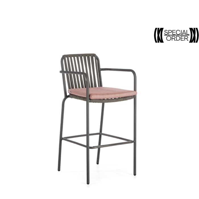 Raise the bar of outdoor seating with the TRINITY Barstool. Crafted with premium DARK GREY STRAP material, sturdy aluminum, and adorned with comfortable DYED ACRYLIC cushions, it offers both style and relaxation.